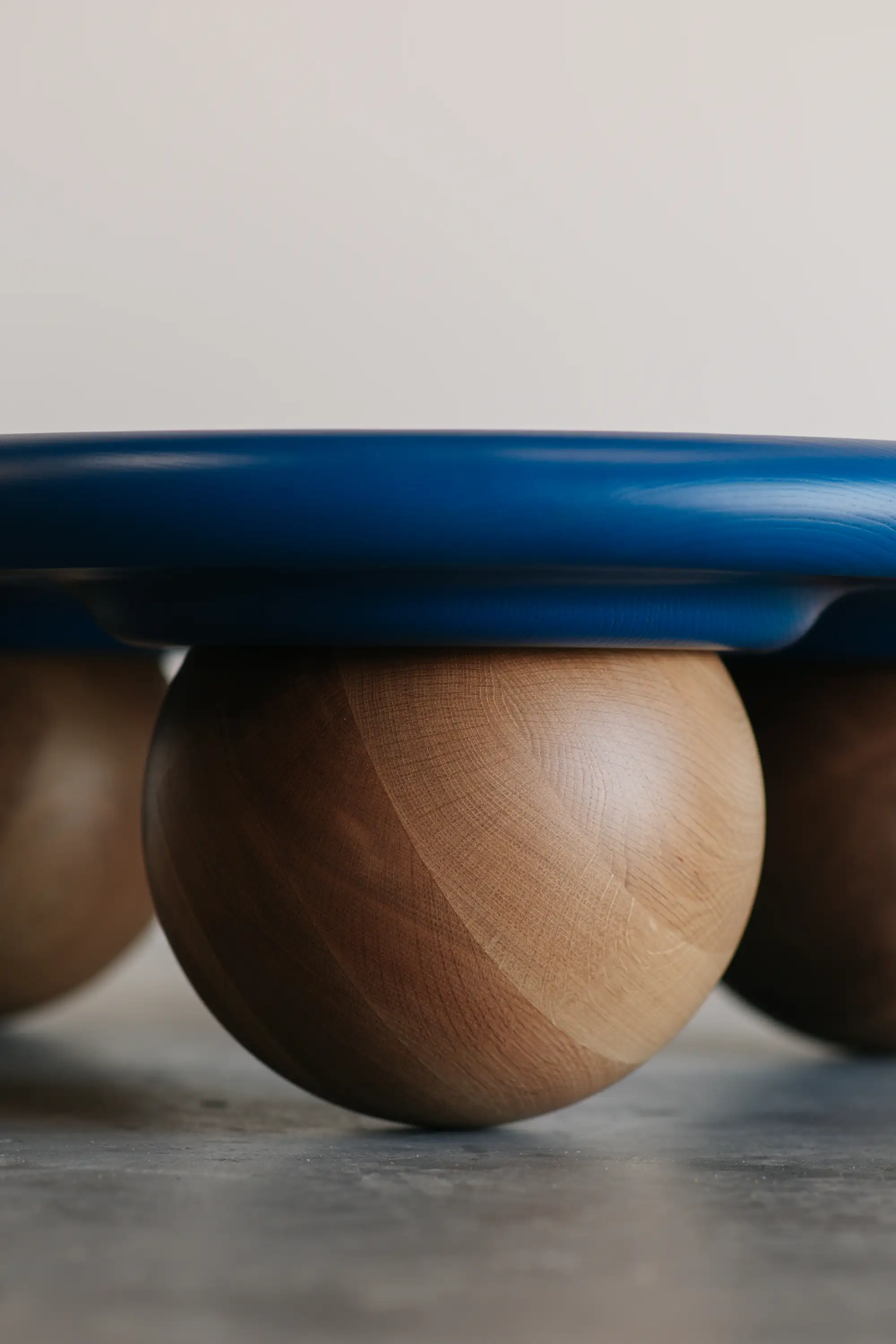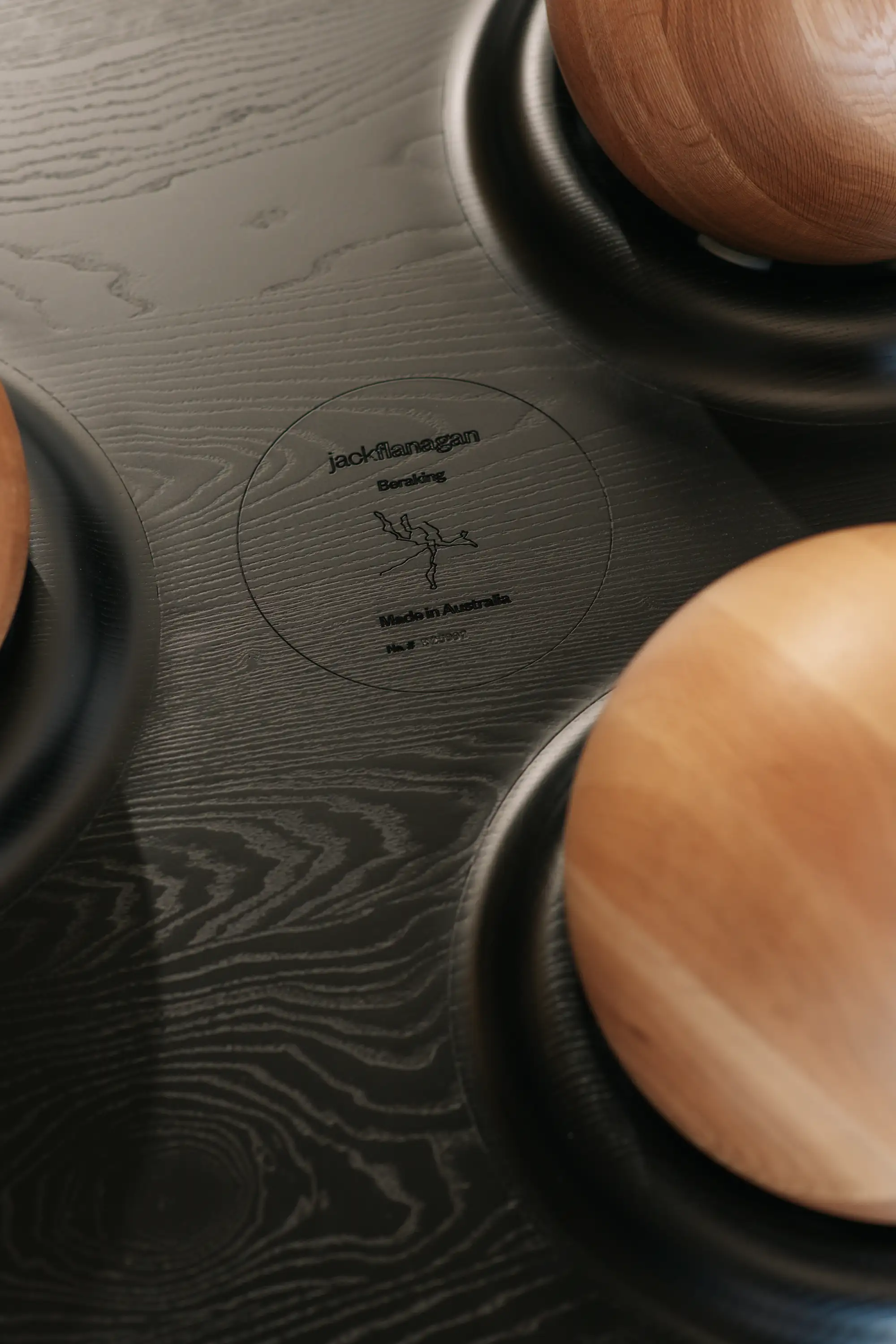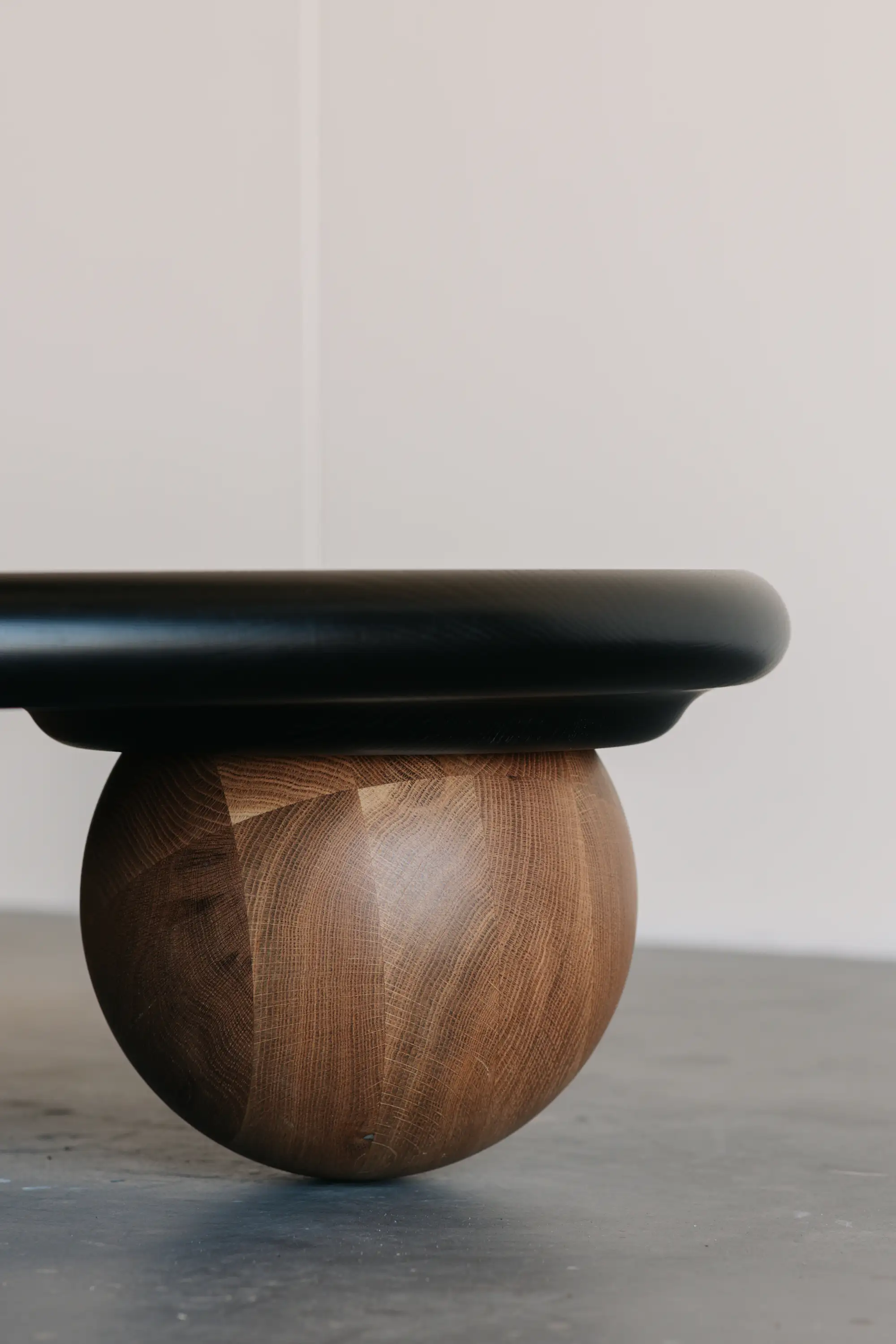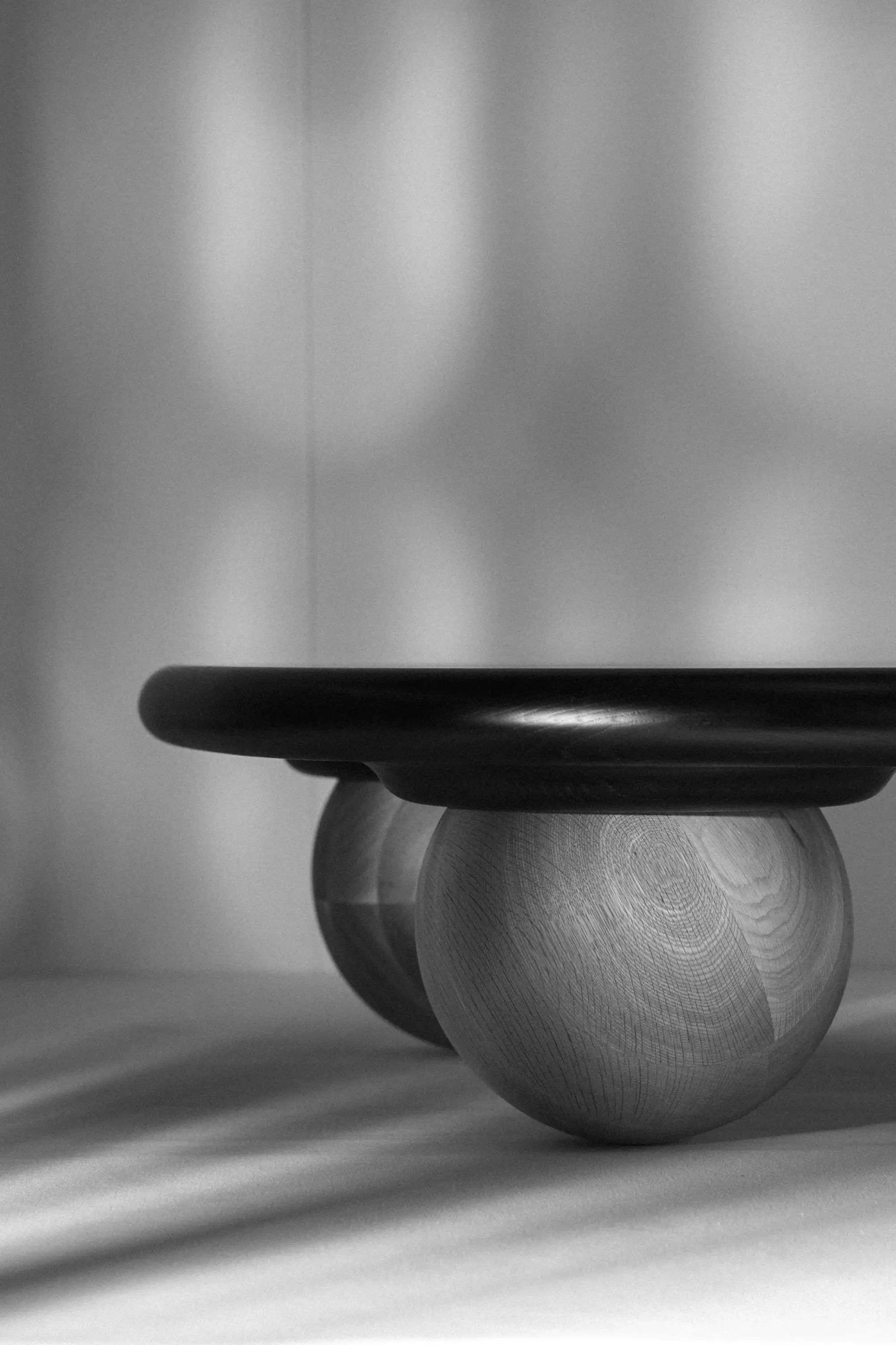 Jack designed the coffee table to smoothly roll along the floor when pushed to mimic this ball bearing like movement. The top and balls are machined out of solid timber.