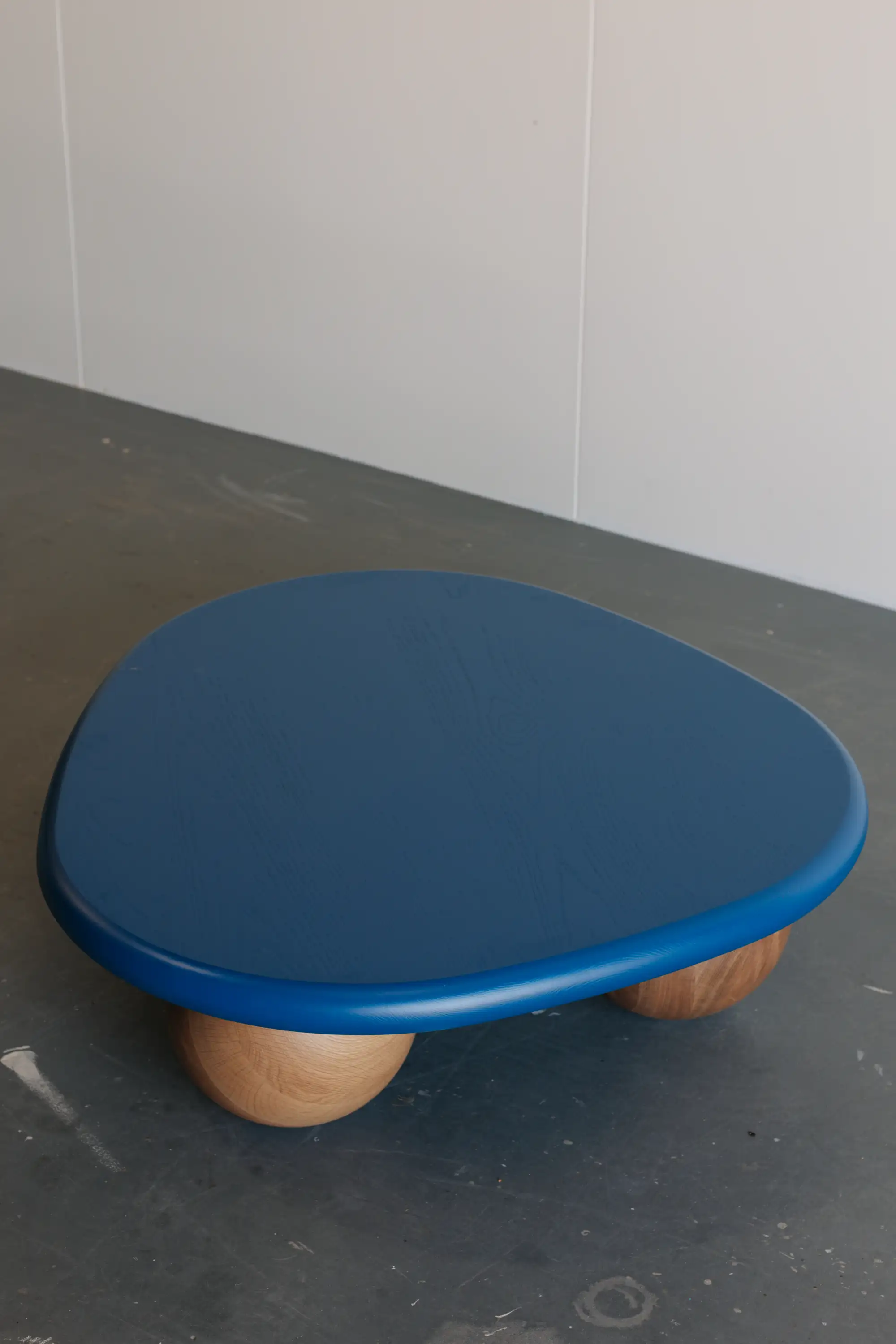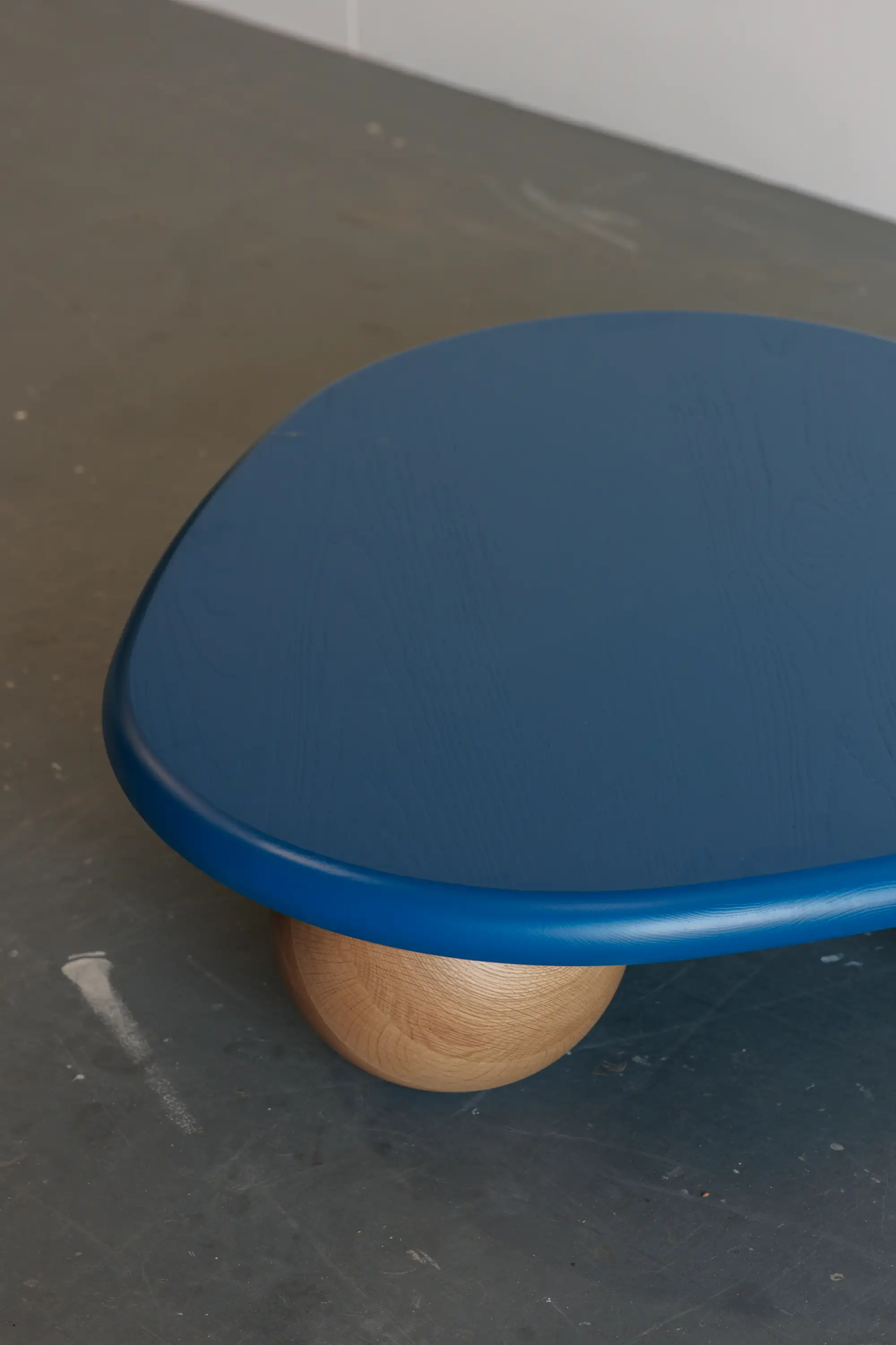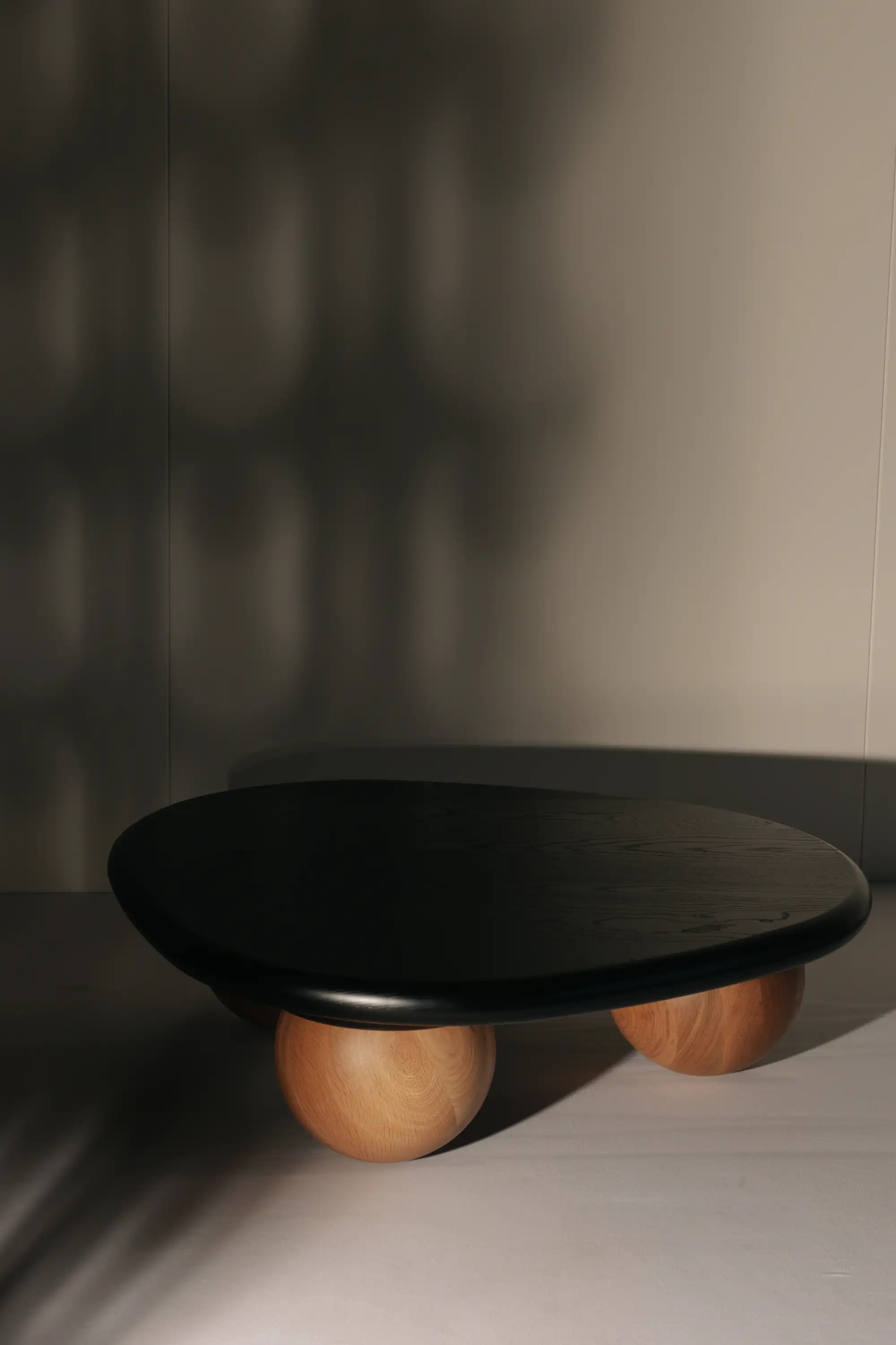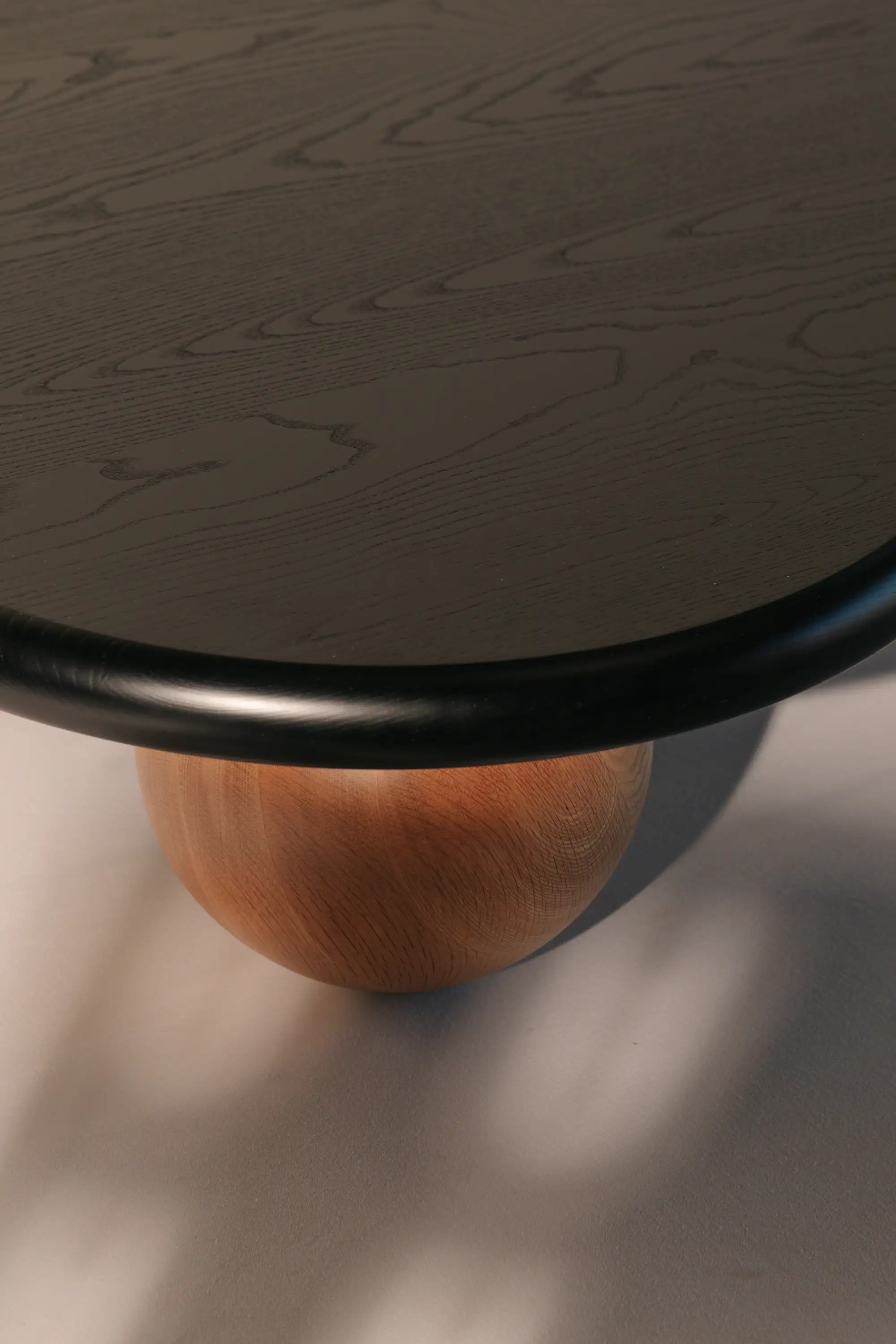 Jack designed the coffee table to smoothly roll along the floor when pushed to mimic this ball bearing like movement. The top and balls are machined out of solid timber.
