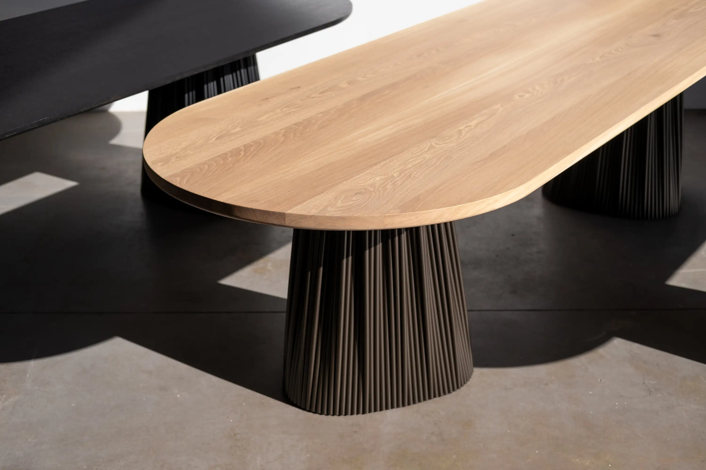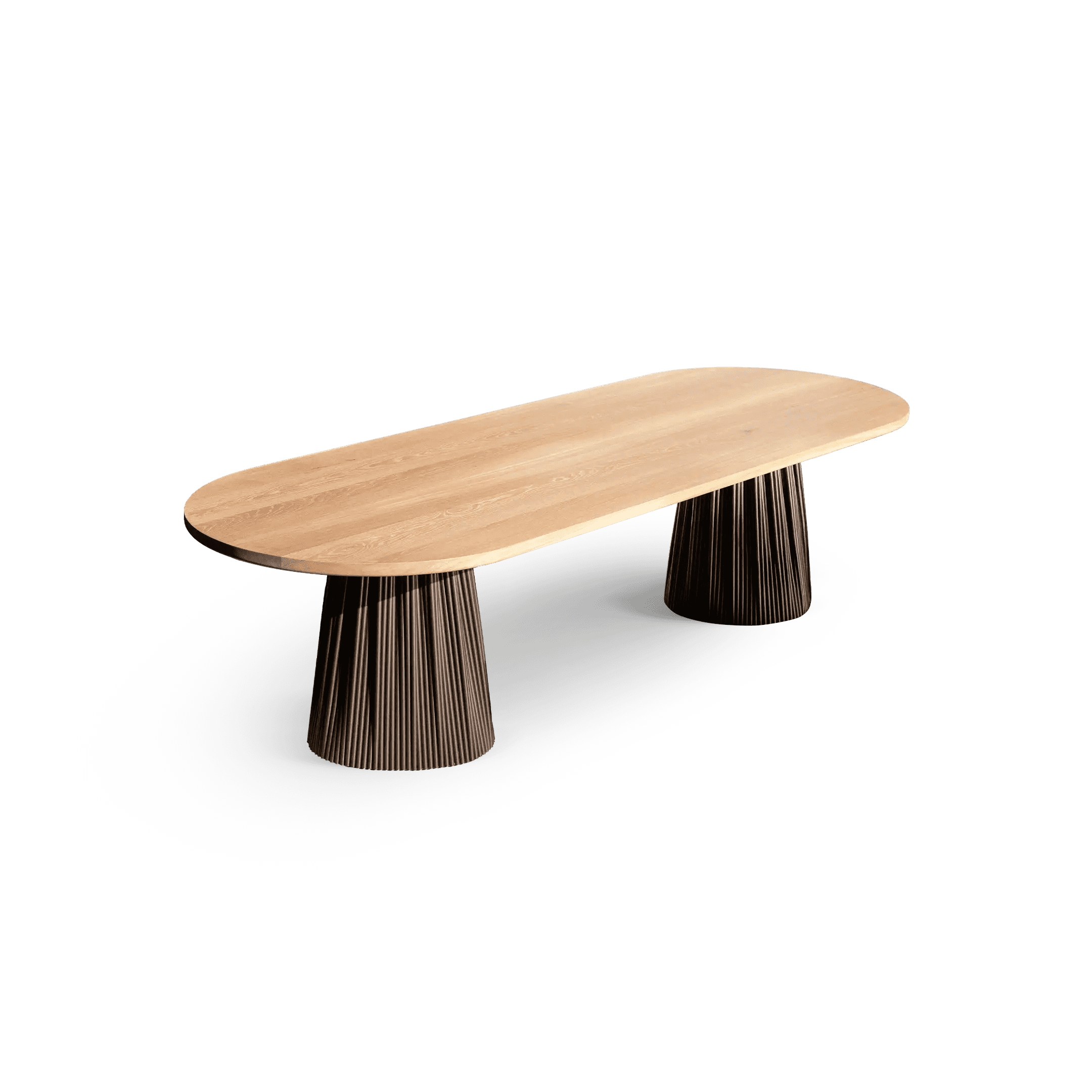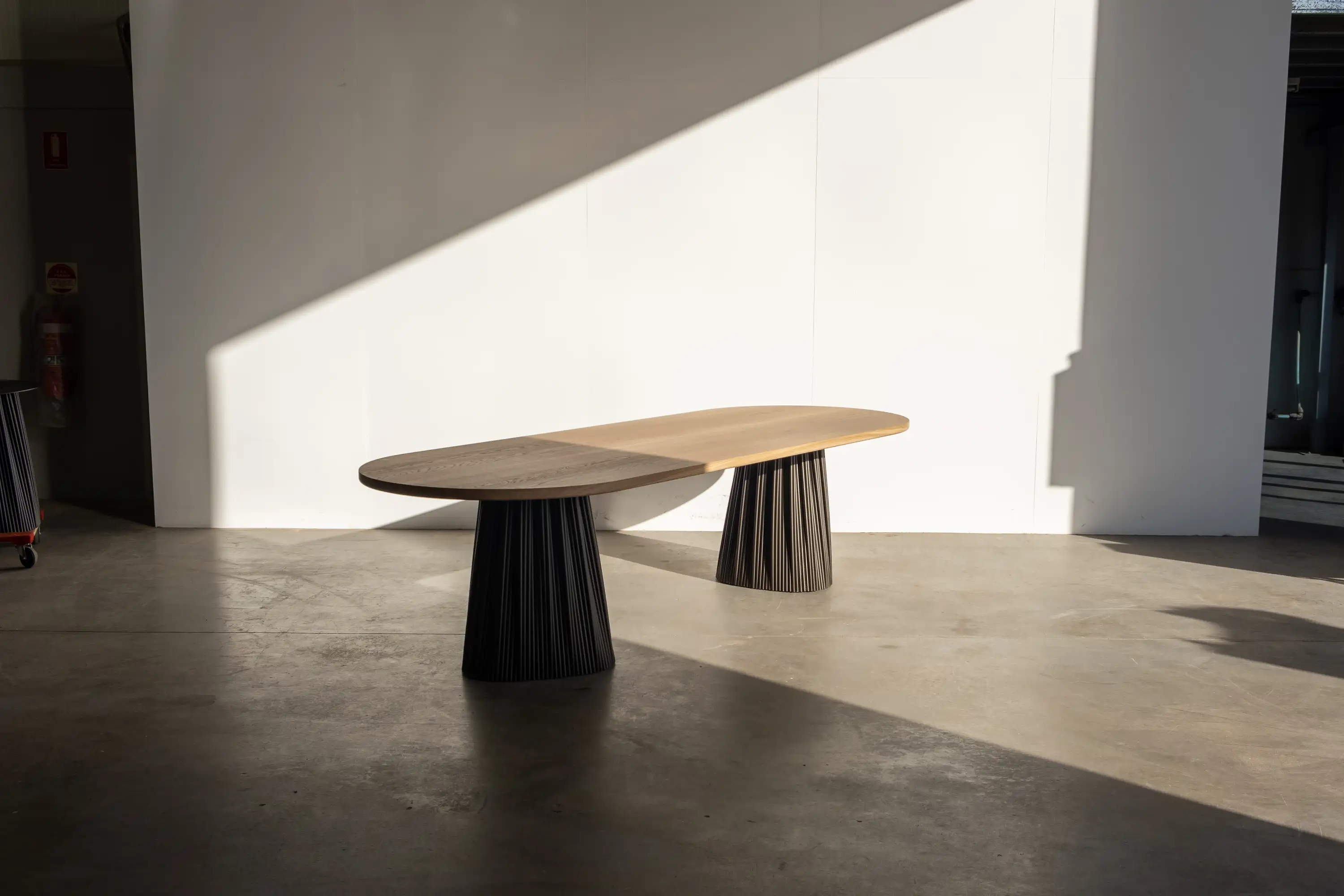 The solution: to gather the steel pipes, with a similar technique as is used in dressmaking. Although the size and shape at the top and bottom are completely different, the perimeters are identical in length.