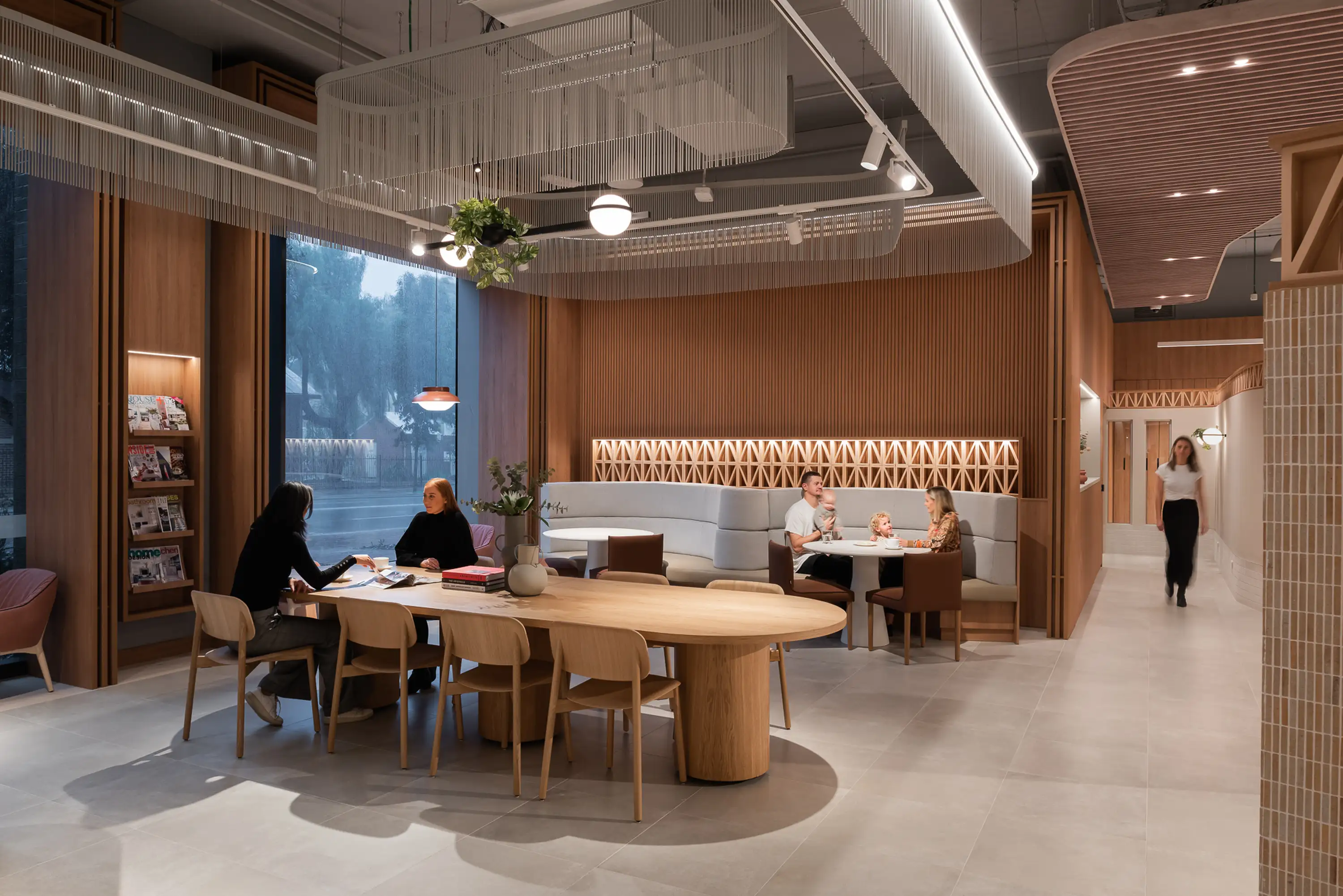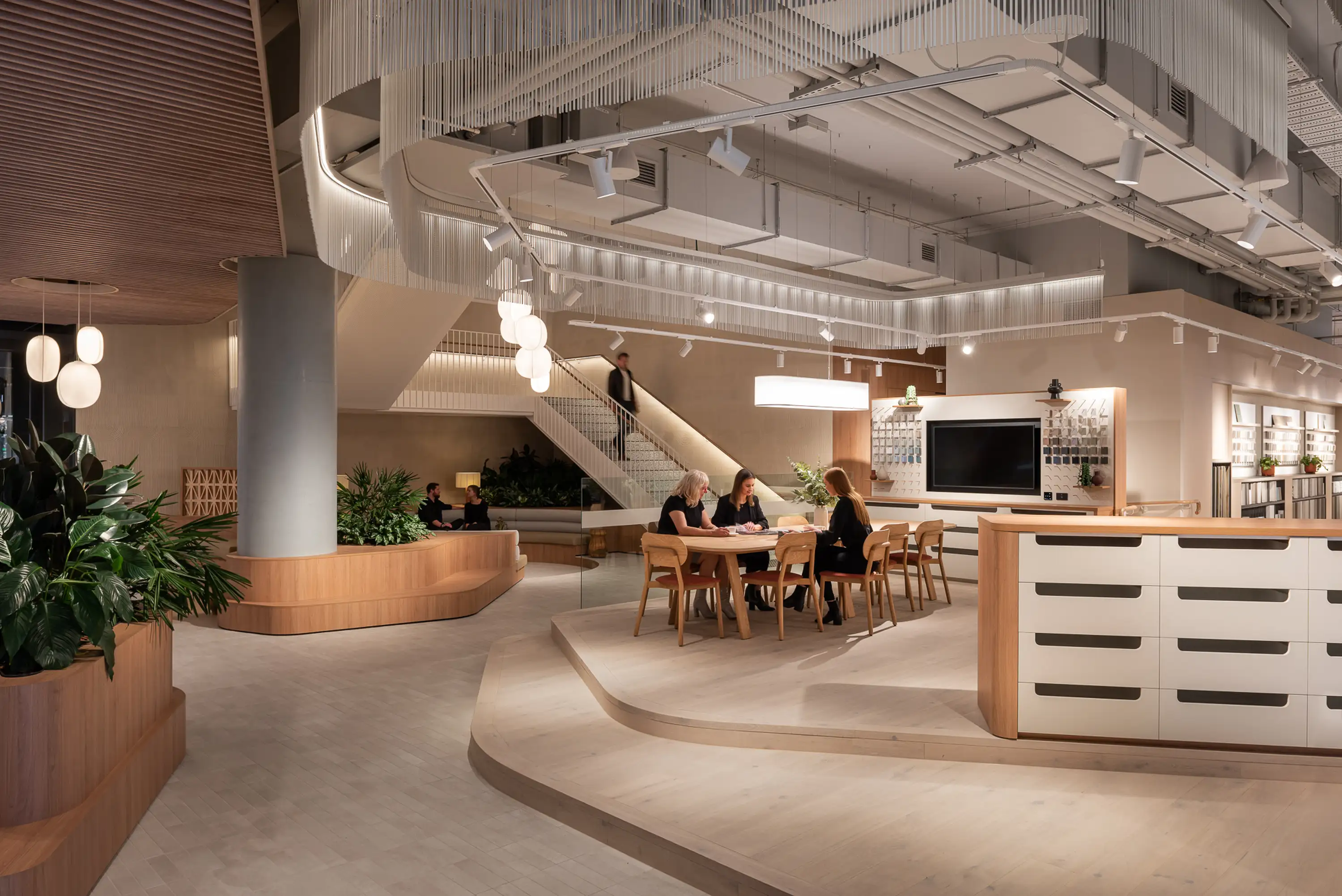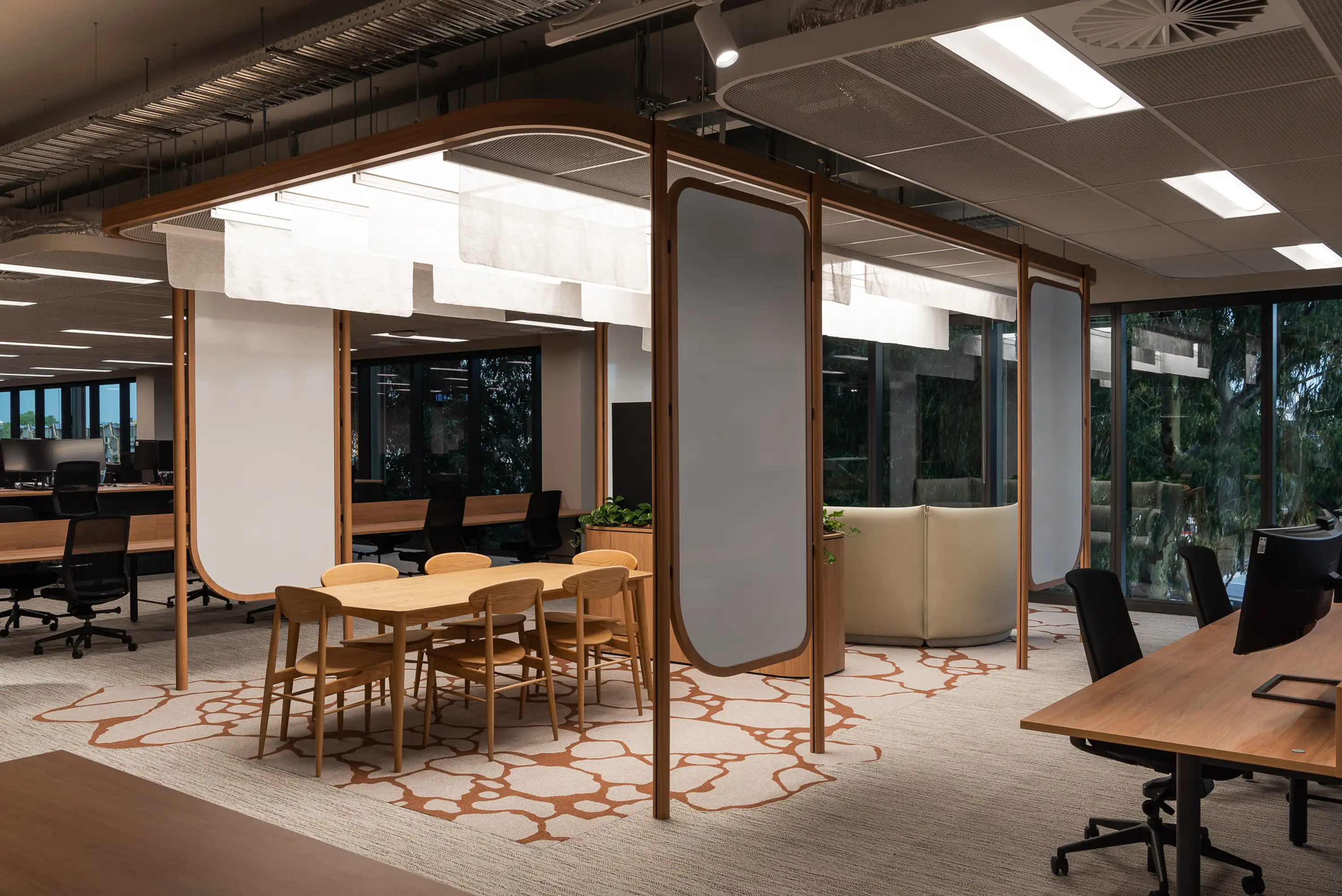 We were engaged to collaborate with Woods Bagot on the design and manufacture of a number of functional and decorative architectural elements throughout the new central hub for the ABN Group. The end result was stunning, and also provided an impressive set of statistics: in total, we manufactured and installed 300 lineal metres of feature lighting across 5 floors, shrouded with 15,000 suspended aluminium rods in custom steel tracks, 50 custom curved-frame whiteboards, and four levels of ceiling features featuring suspended timber frames with draped fabric.