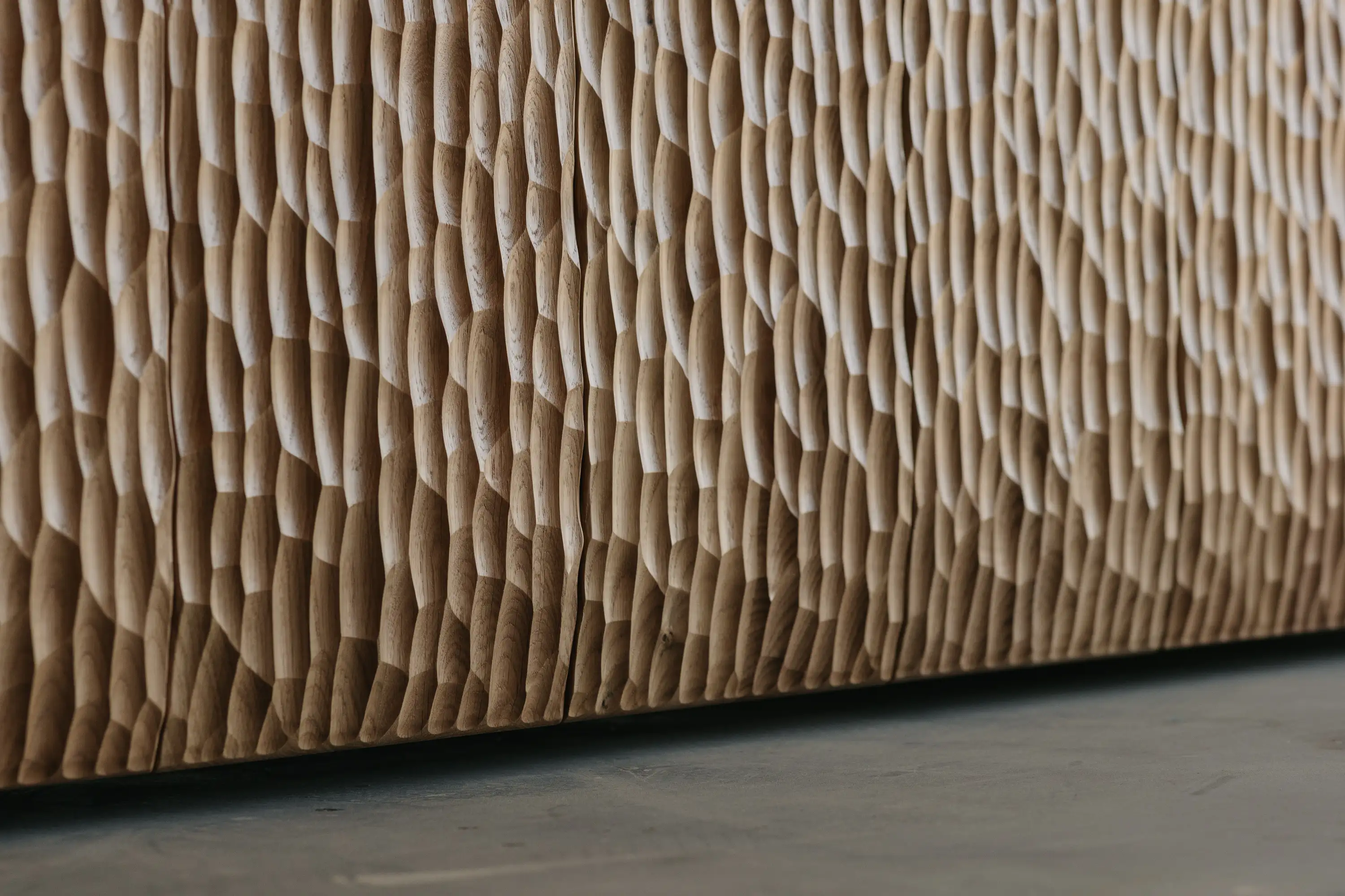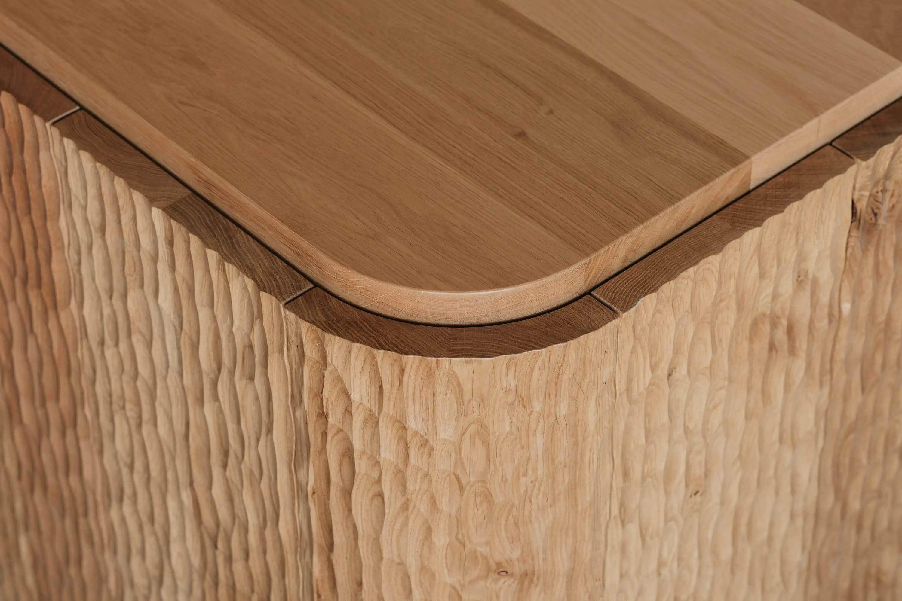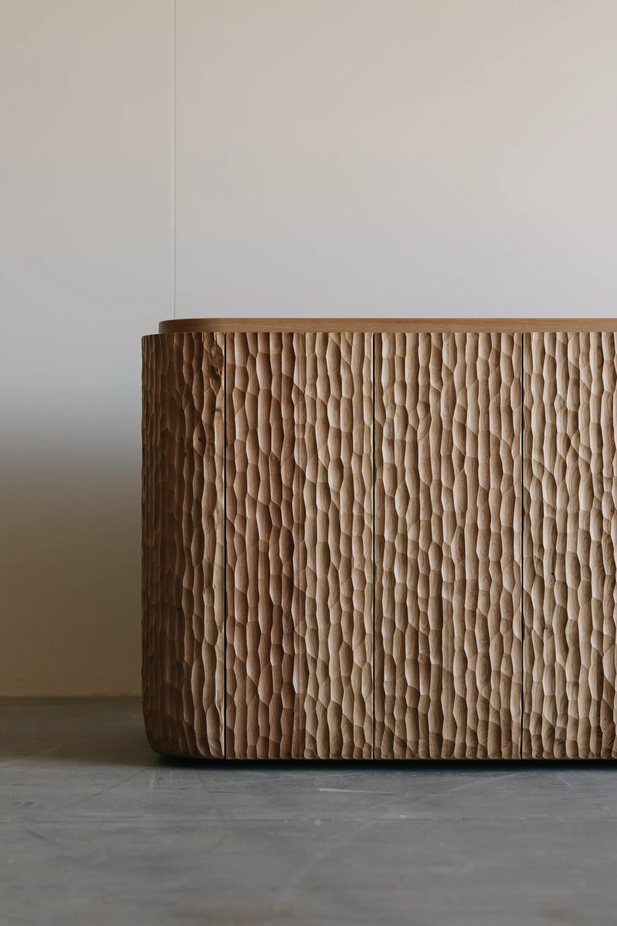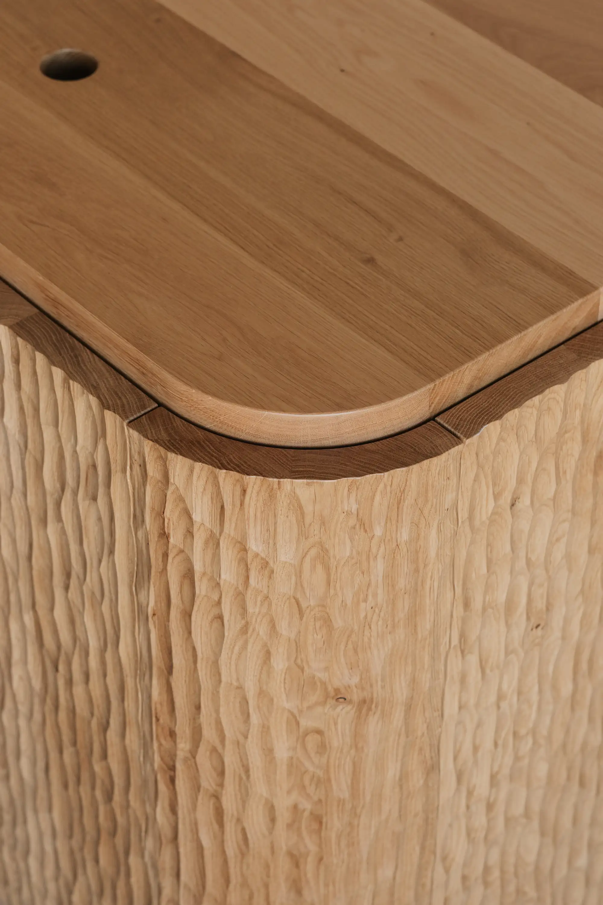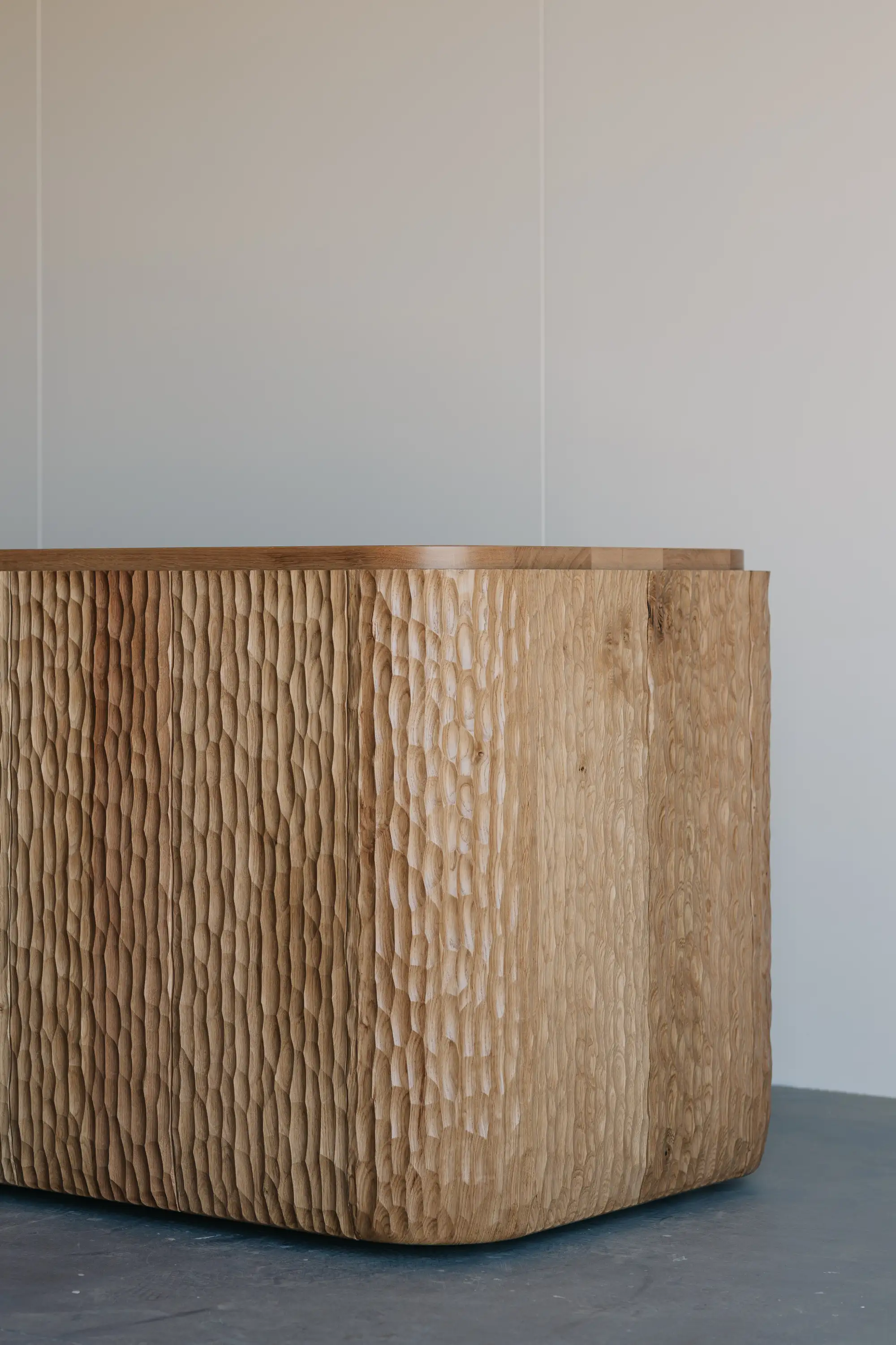 We were commissioned to design a mobile coffee cart, aesthetics and material were very important to fit the space but also needed to incorporate all the functional requirements like soft wiring, water storage and plumbing locations to accomodate the coffee machine and appliances. The cladding of the cart is made from Naguri textured solid oak with the bench top seaming to extrude itself out the top of the cladding.