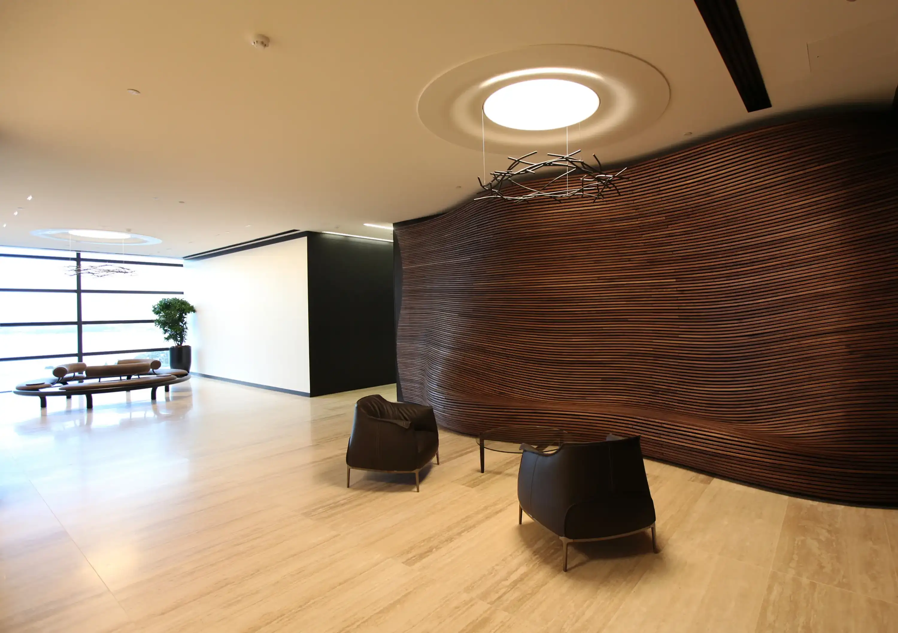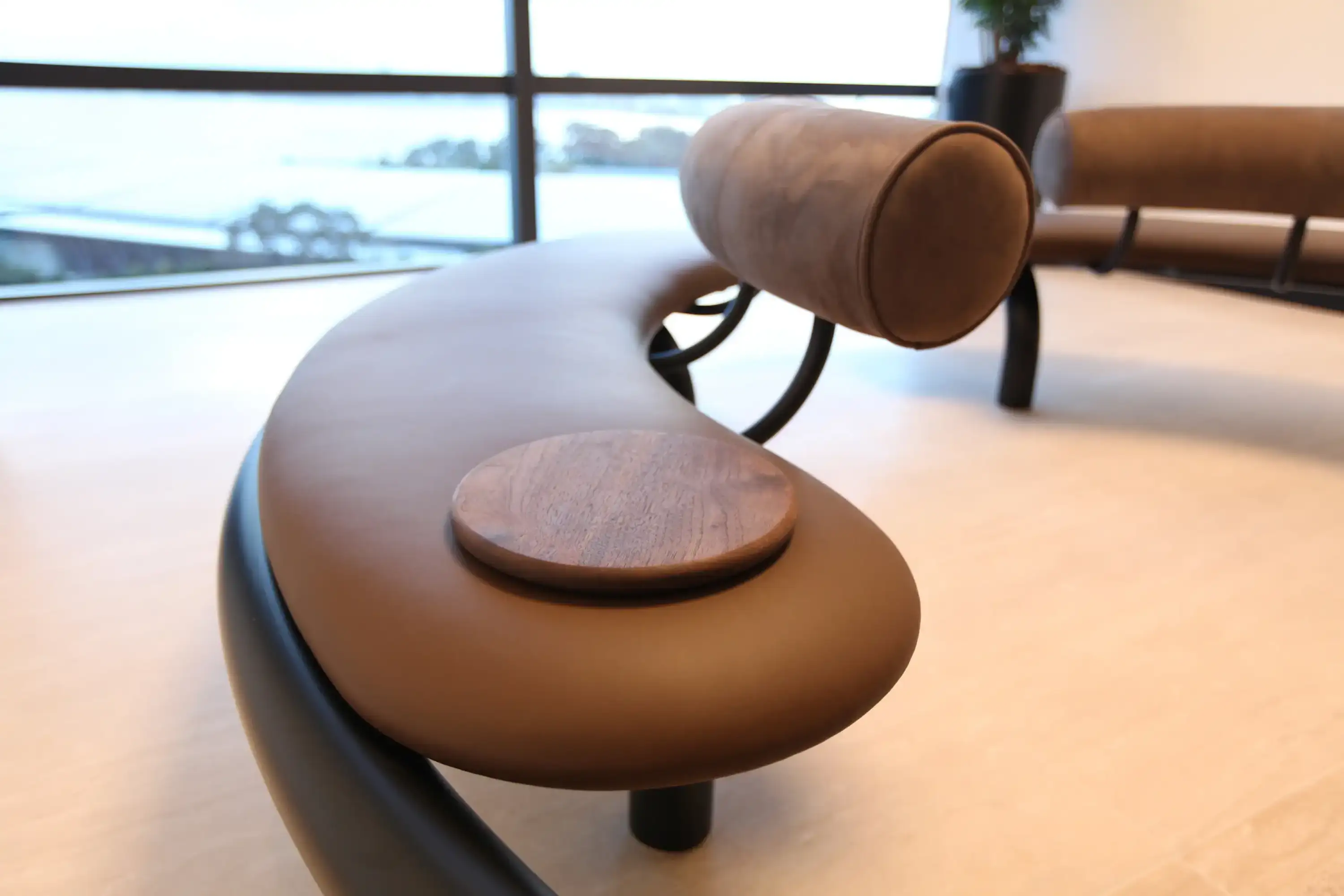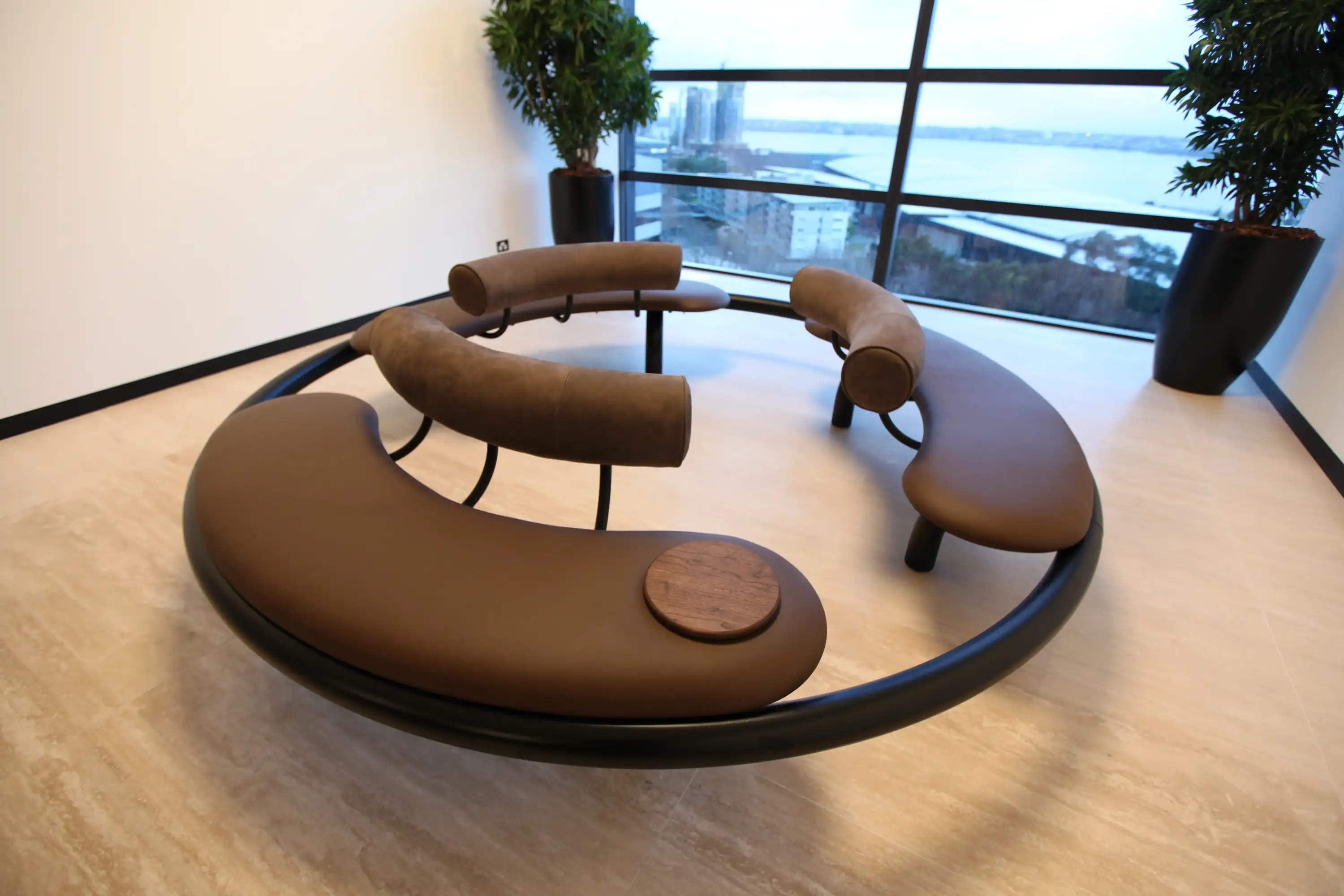 KPMG — seatingWe designed this steel and leather seating to arrive on site in 3 identical sections. The seat is completely cantilevered and can only balance when all 3 modules are connected.