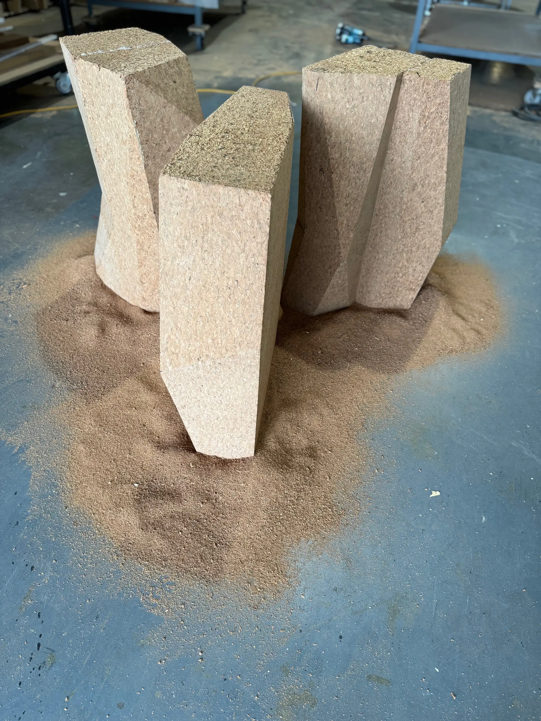 This table was a challenge trying to get various elements to all functionally work togethor while still achieving the desired appearance. The top is 1800mm diameter with the ability to extend to 3200mm with a hidden folding leaf underneath that butterflys up. The legs are carved out of solid blocks of cork using a chainsaw. This was a special table within Karijini house project.