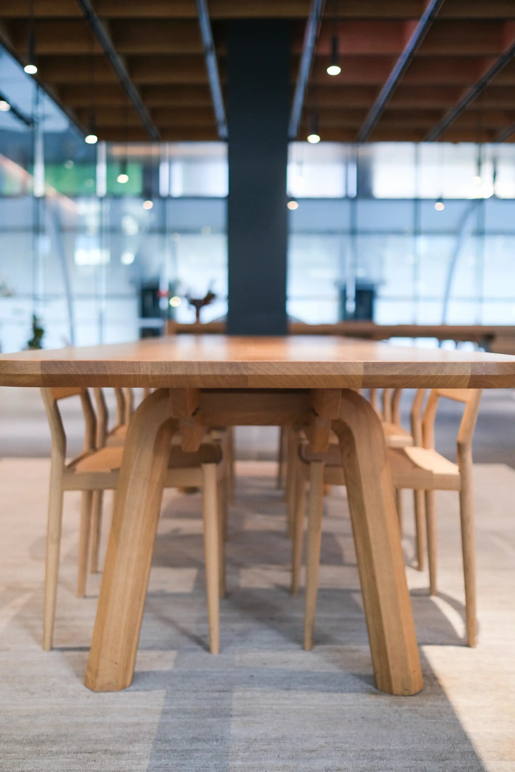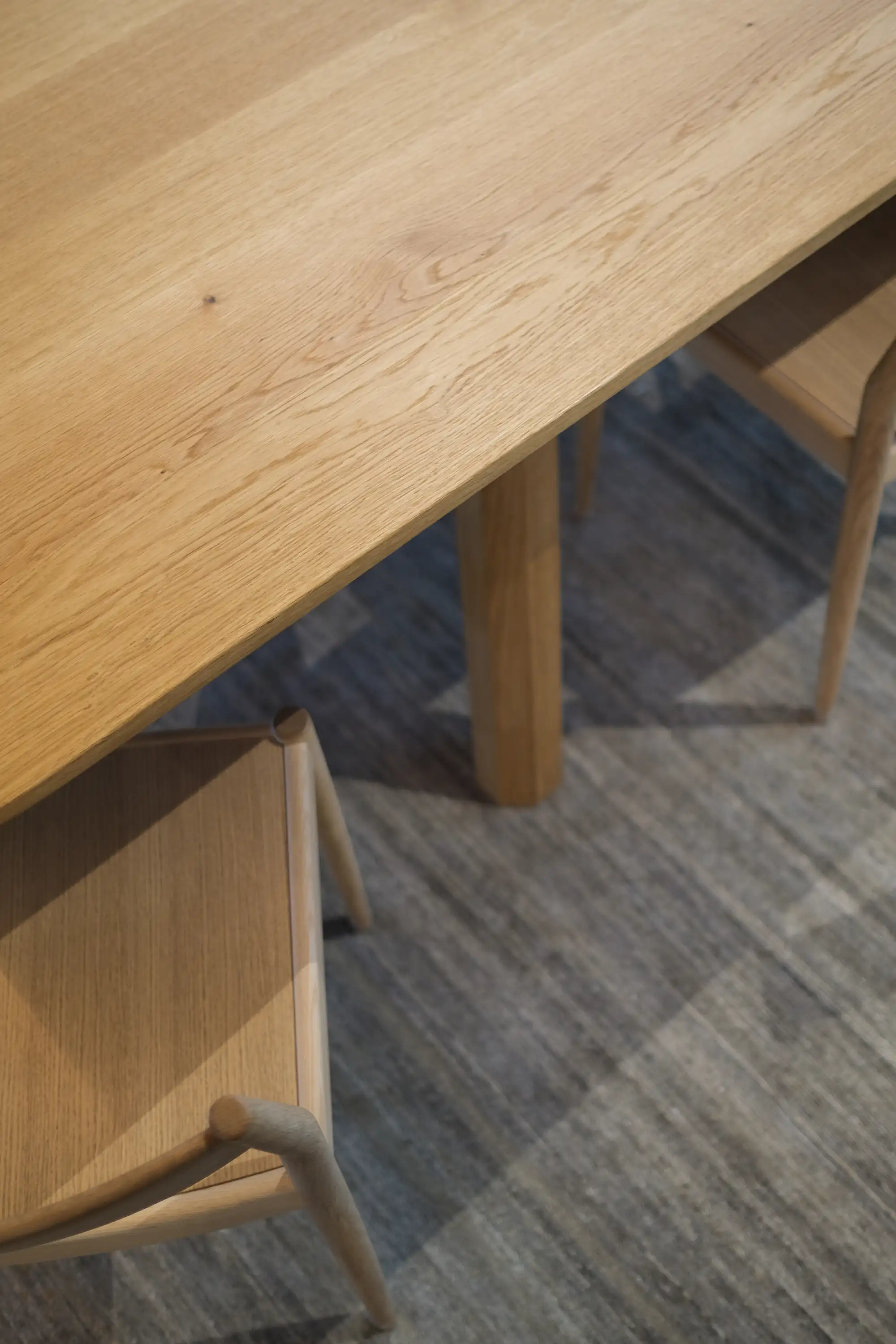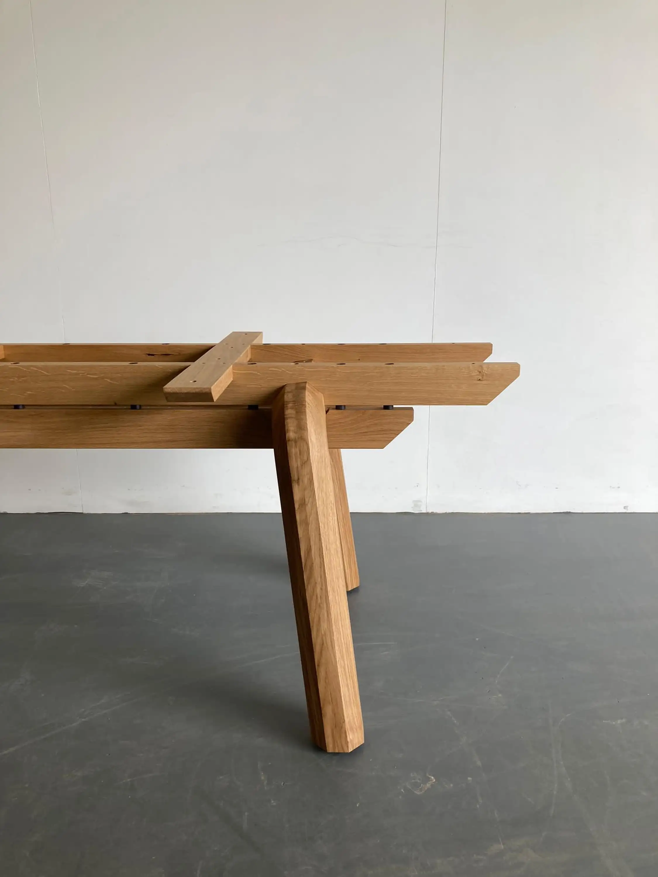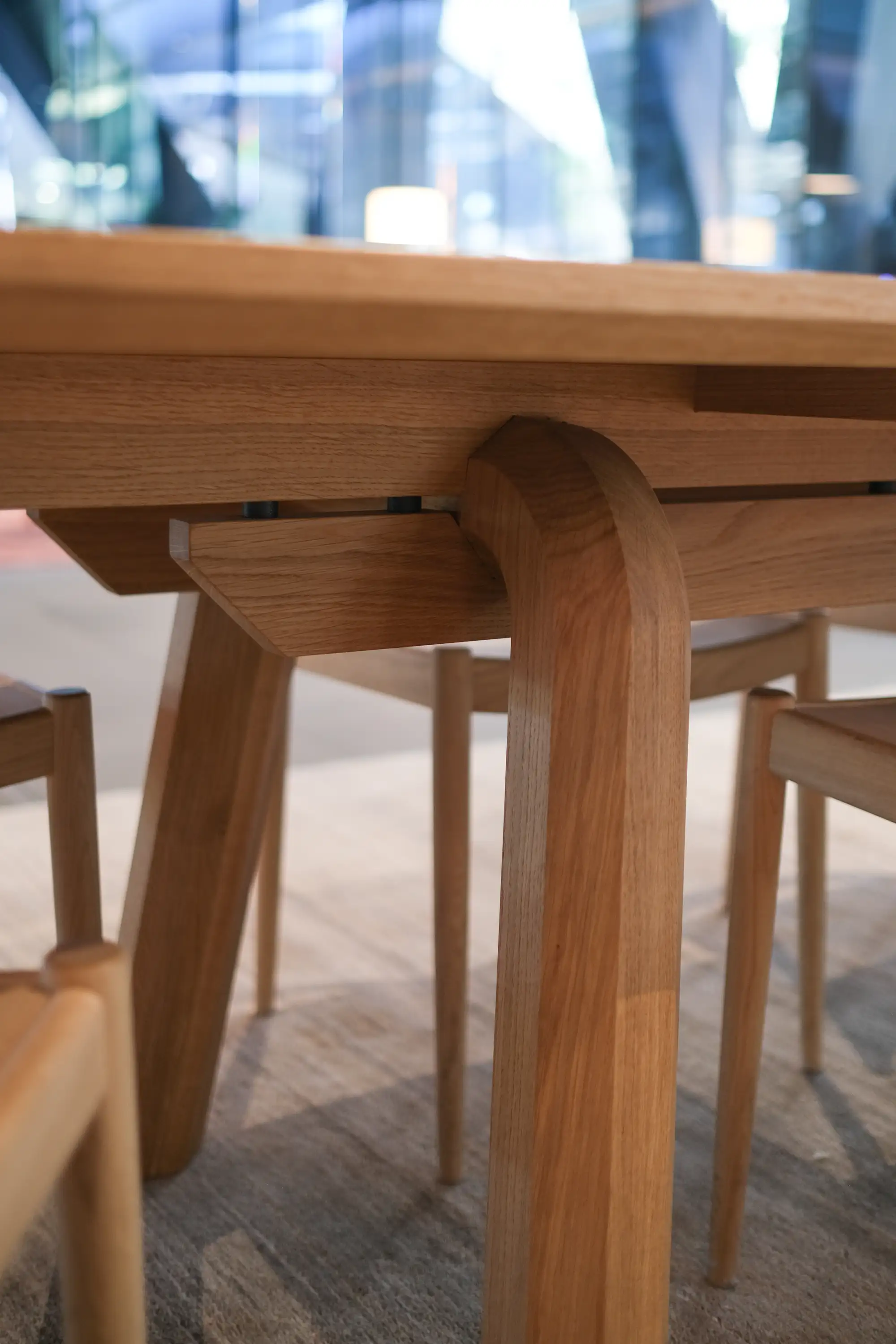 We designed this table around the interesting joint where the timber subframe rails clamp the trestle style legs, locking them into their final position. This a hint towards the building which is a timber hybrid constructed commercial office building.
