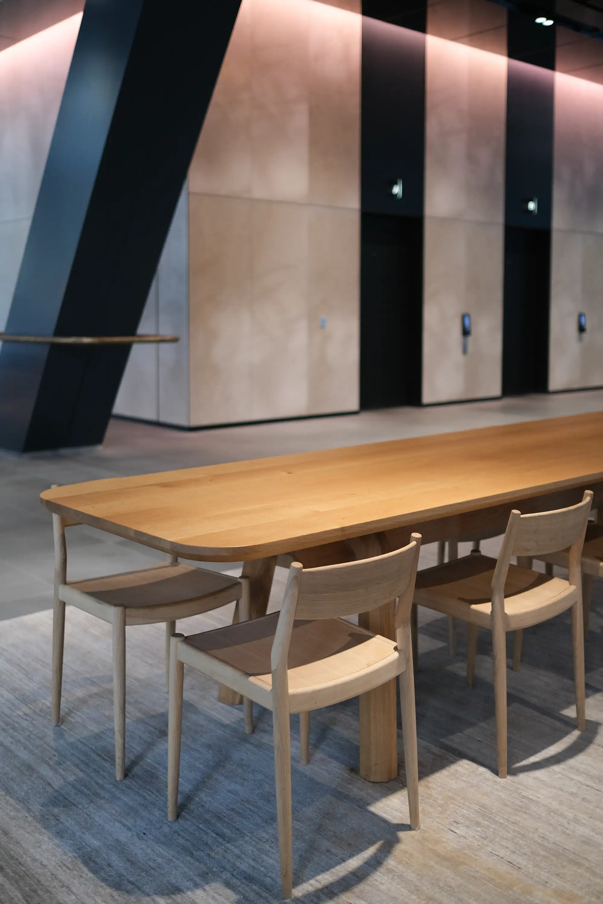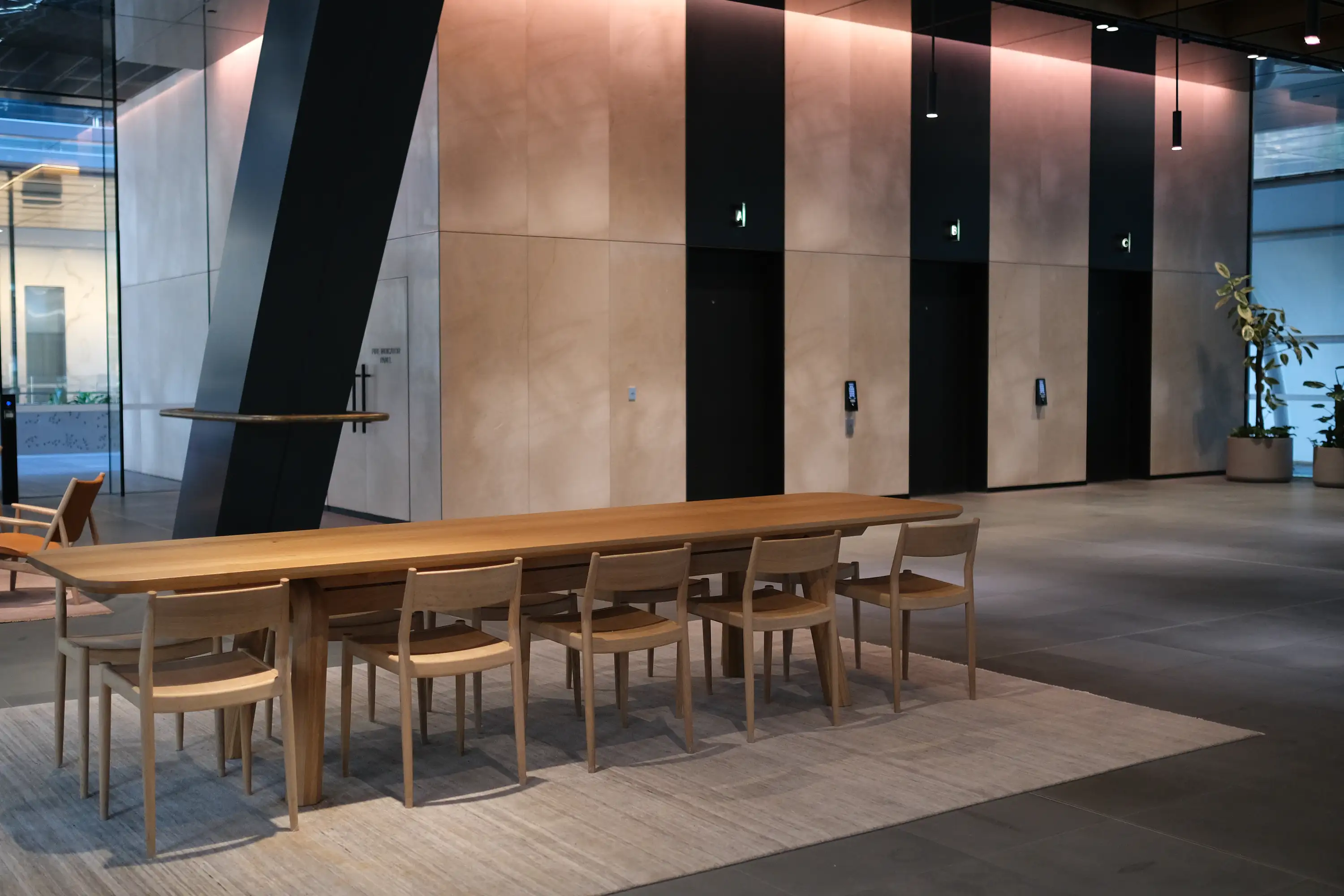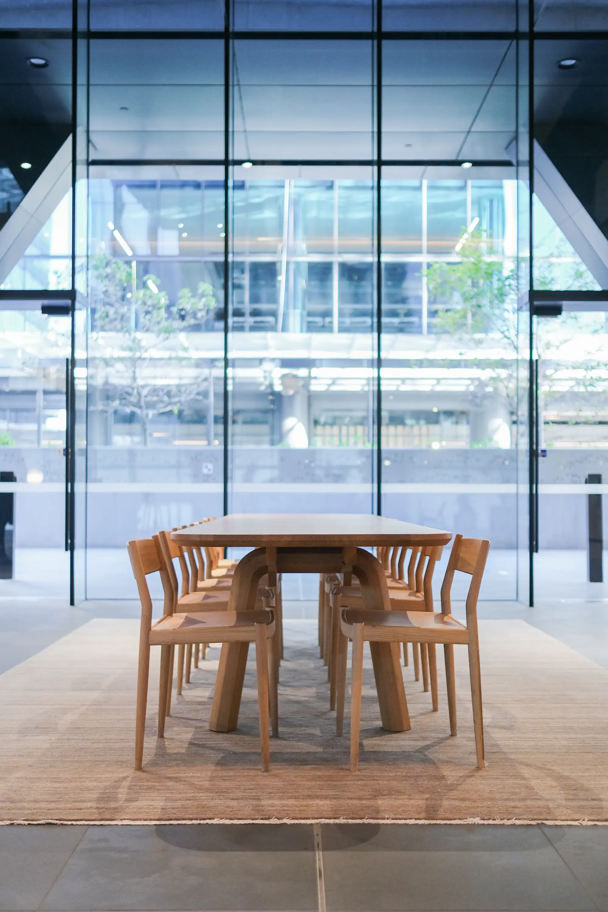 We designed this table around the interesting joint where the timber subframe rails clamp the trestle style legs, locking them into their final position. This a hint towards the building which is a timber hybrid constructed commercial office building.