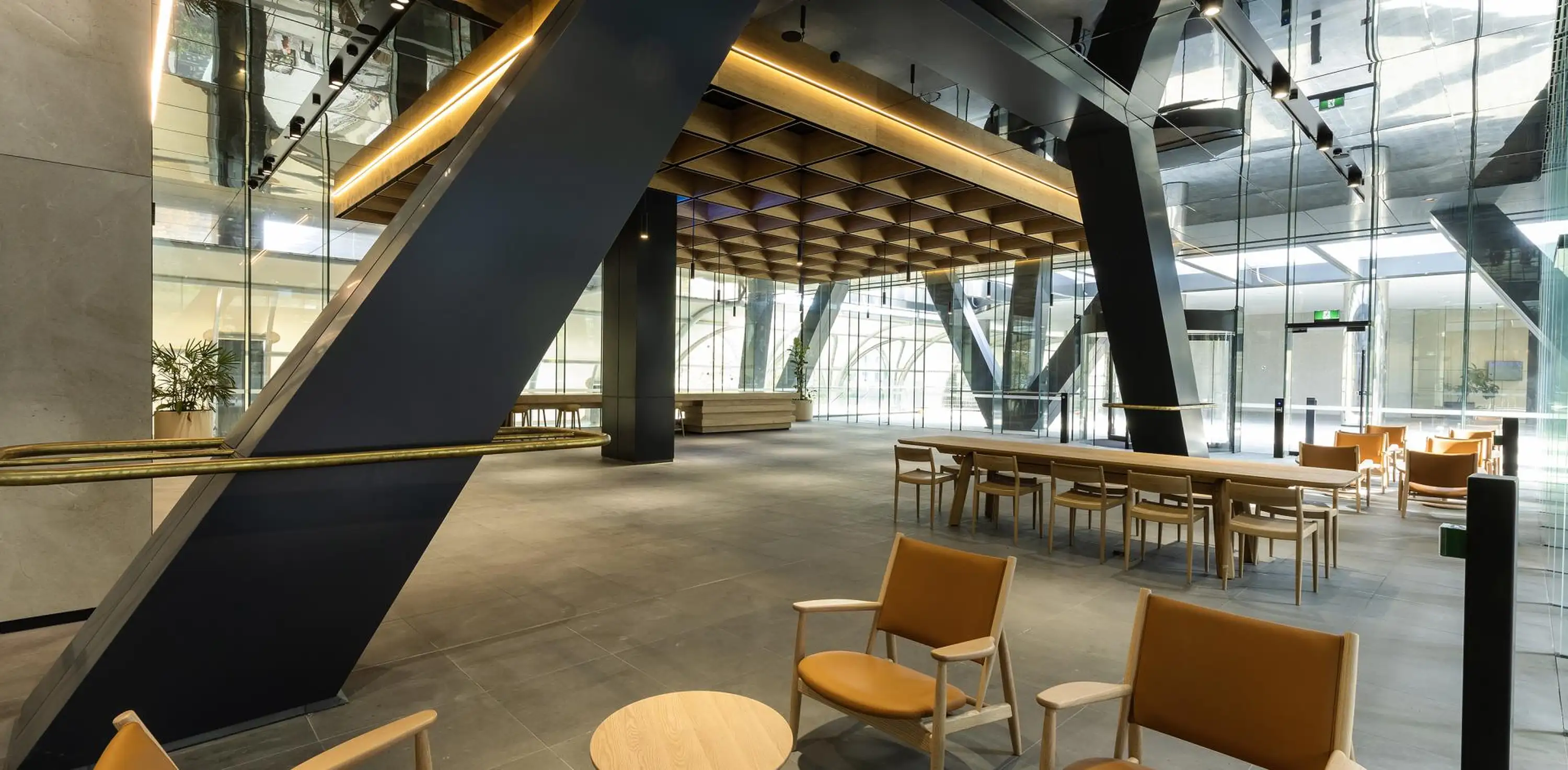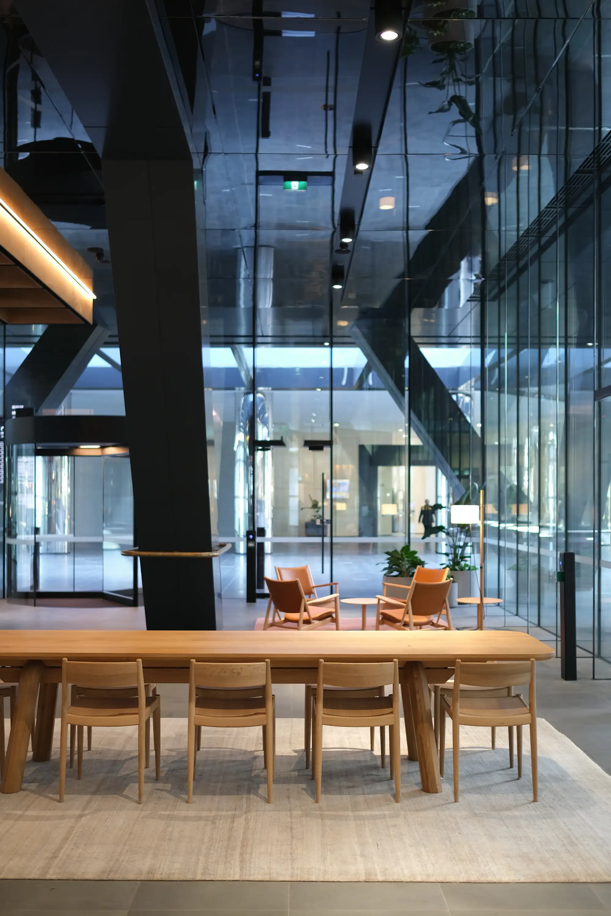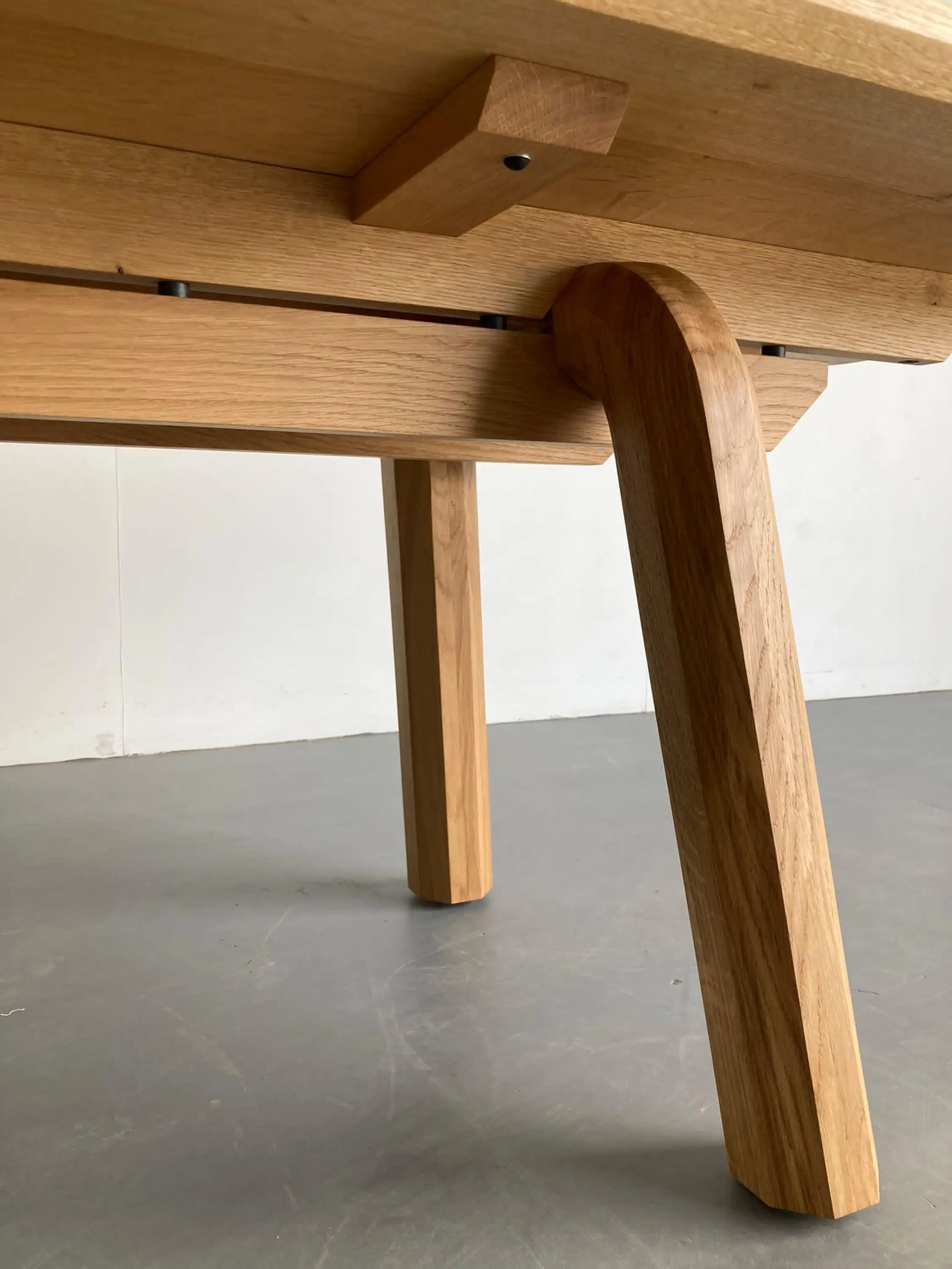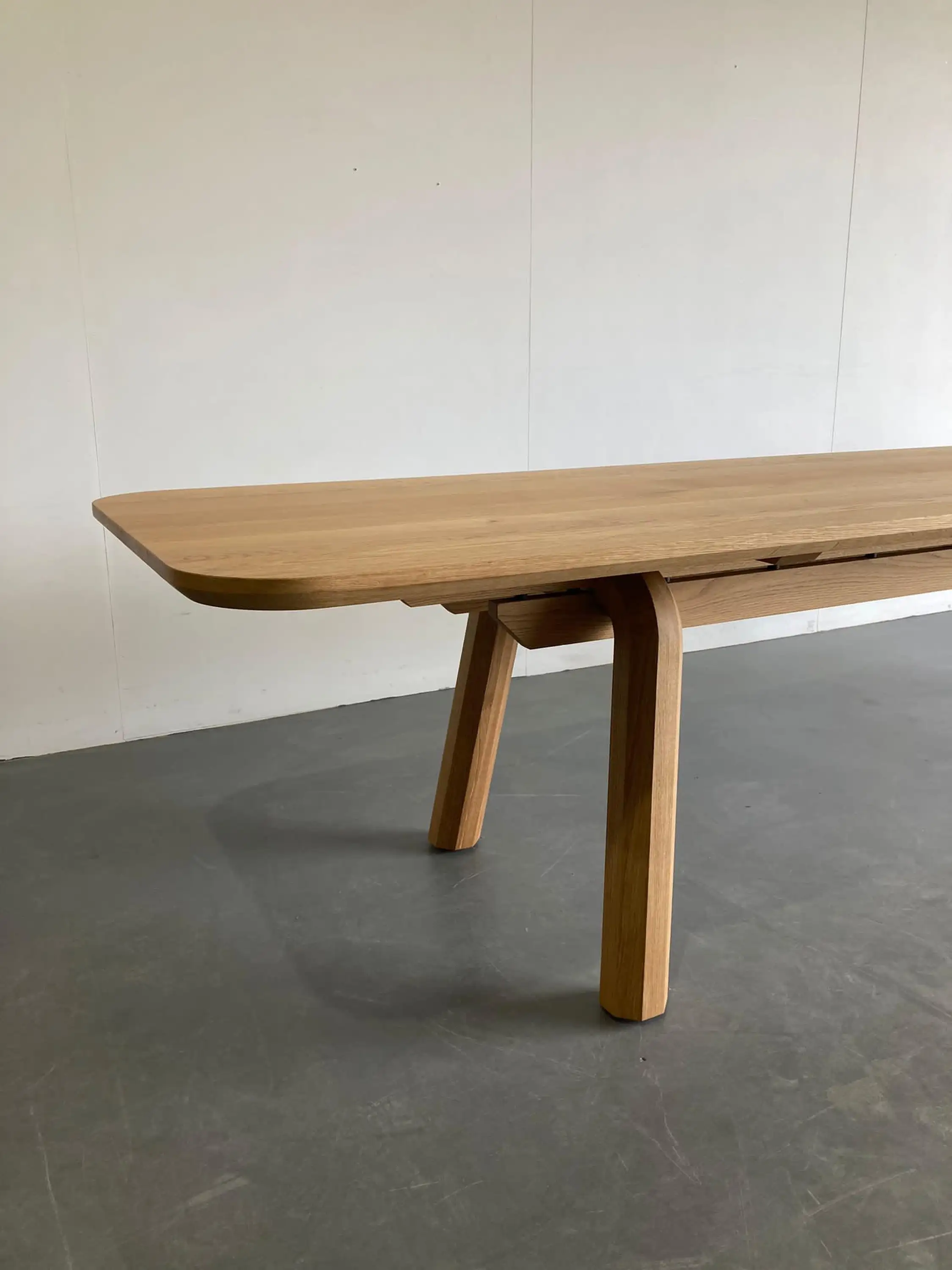 We designed this table around the interesting joint where the timber subframe rails clamp the trestle style legs, locking them into their final position. This a hint towards the building which is a timber hybrid constructed commercial office building.